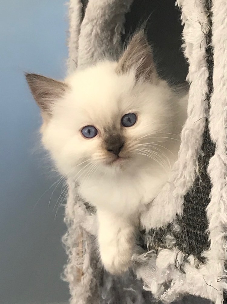 As adults Blue Mitted cats have a light grey coat, legs and tail, with darker grey ears and face and white feet, tummy and chin